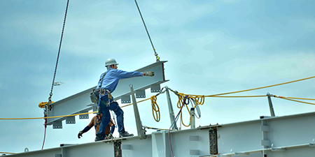 高層ビルなどで、タワークレーンを使い、人間でいうと骨組みになる鉄骨を吊り上げ、組み立てていきます。当然安全に十分配慮した形ですが、高所での作業を行います。「鉄骨建方」と呼びます。安全のためのネットや安全帯の設備の設置も同時に行っていきます。
